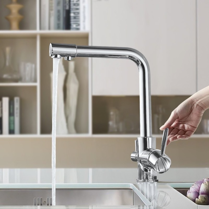 Un grifo de fregadero de 3 vías modelo Europa, ofrece una solución funcional que optimiza el flujo de agua al permitir la selección entre agua corriente (fría y caliente) y agua filtrada o purificada desde un solo grifo. Estos son algunos de los beneficios clave de instalar un grifo de fregadero de 3 vías: