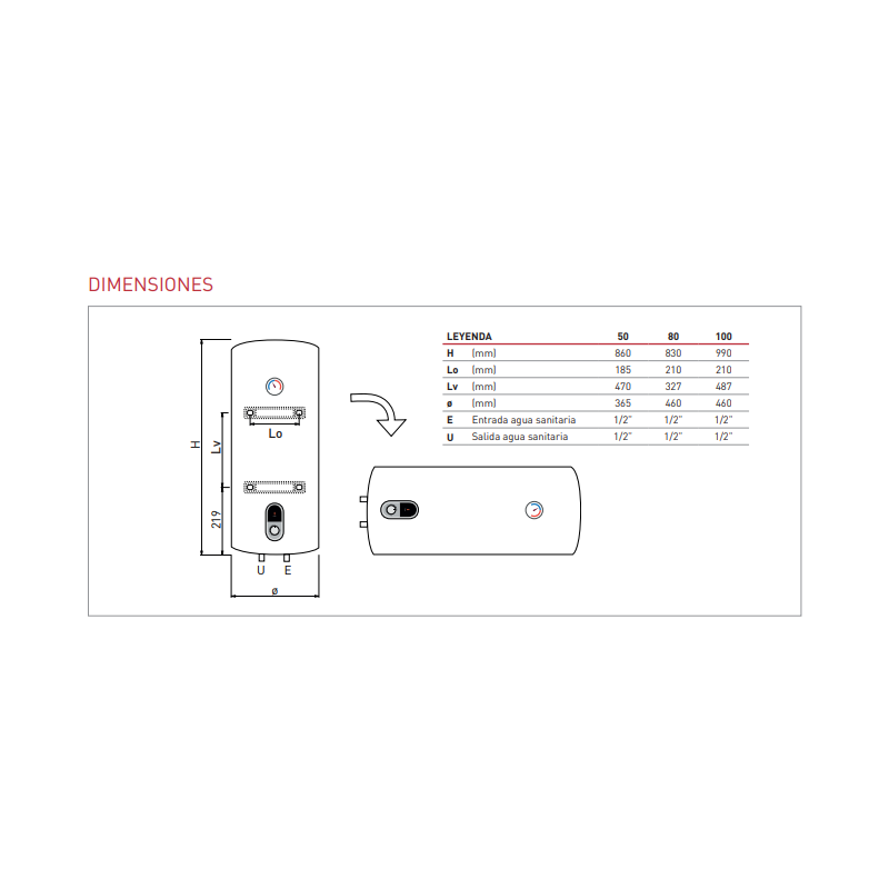 Termo eléctrico 80 Litros SIME Lago. Multiposición con resistencia envainada. Alto 830 mm x Diametro 460 mm